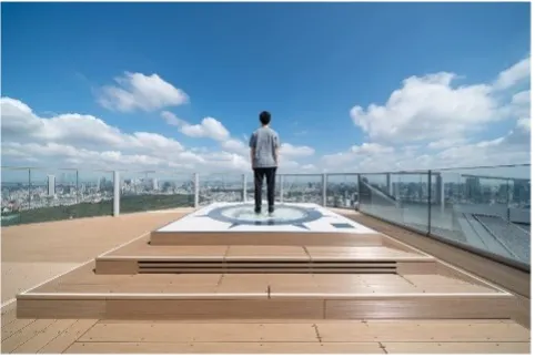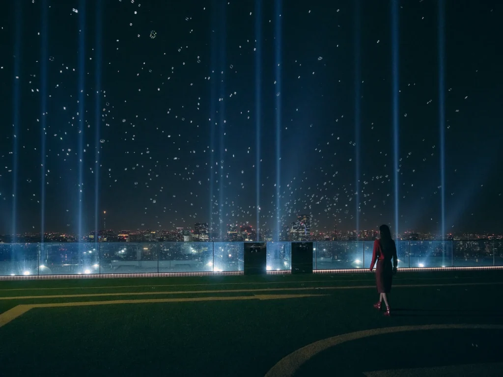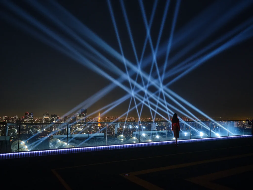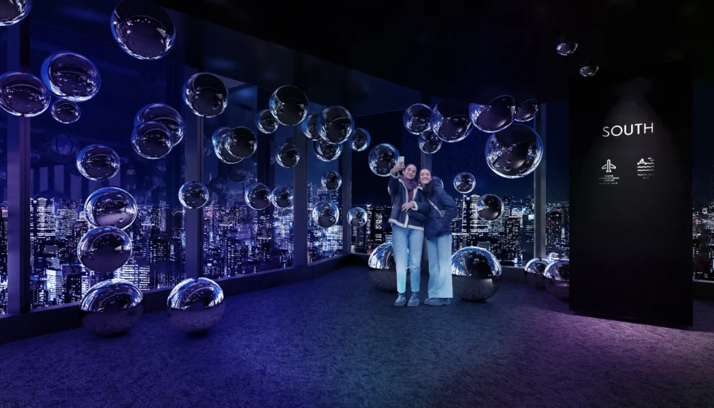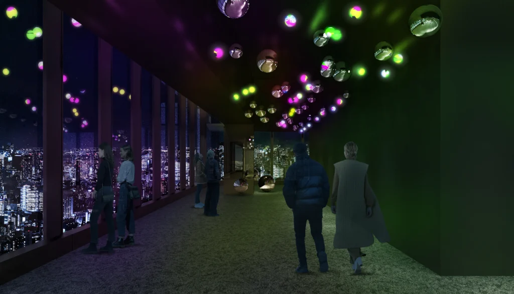 46階の「SKY GALLERY」では大小のミラーバルーンが360°に広がる東京の眺望を映し込み、光を乱反射させながら訪問者の動きに合わせて表情を変える。さらに全方位型照明「NEBULA」とサウンドアーティストevalaによる立体音響が組み合わさり、視覚と聴覚を通じた没入体験を提供する。