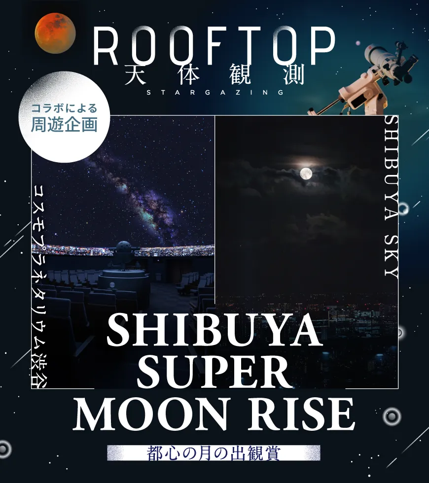また屋上では天体観測イベント「SHIBUYA SUPER MOON RISE」を開催し、天体望遠鏡を通じて月の出や天文現象を楽しめる。渋谷最高峰229mの展望施設は、都市の景色と冬の特別演出、音と光の体験を一度に味わえる場所である。
